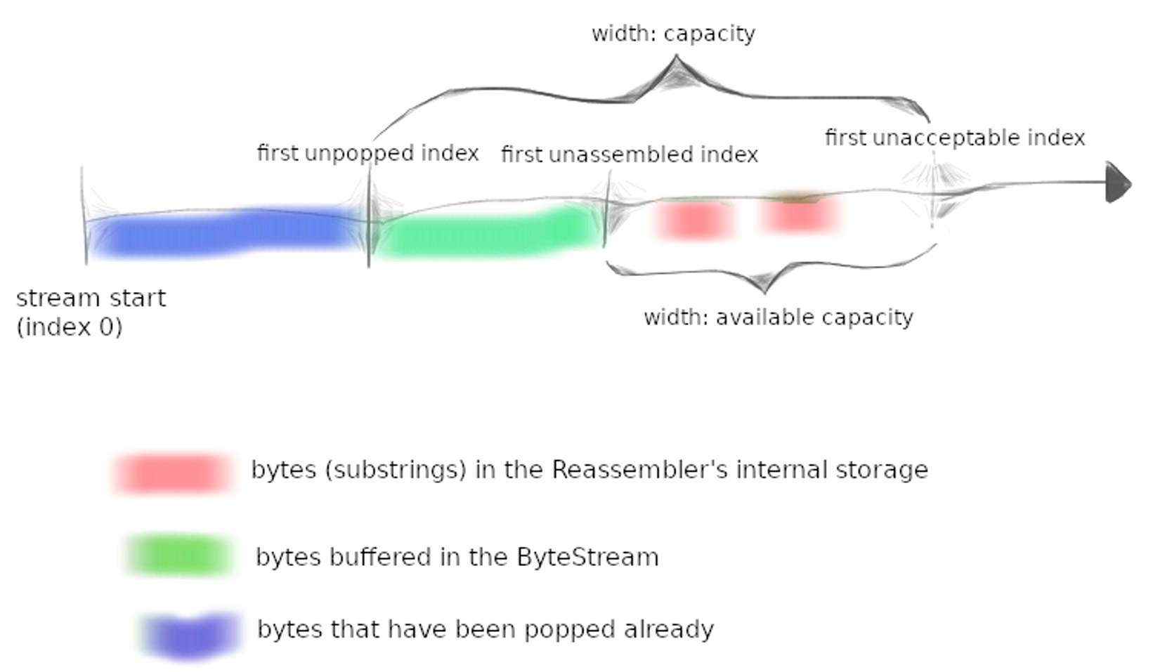 在本实验中,需要编写负责这种重装的数据结构:一个重装器 (Reassembler)。它将接收子串,每个子串包含一串字节,以及该字符串在更大流中的起始字节索引。流的每个字节都有其唯一的索引,从零开始向上计数。一旦重装器知道流的下一个字节,就会将其写入 ByteStream 的写入端——也就是在 checkpoint0 中实现的相同 ByteStream。重装器的“客户”可以从同一 ByteStream 的读取端读取数据。